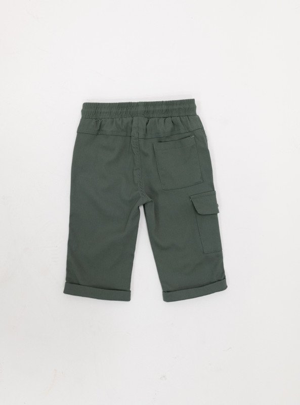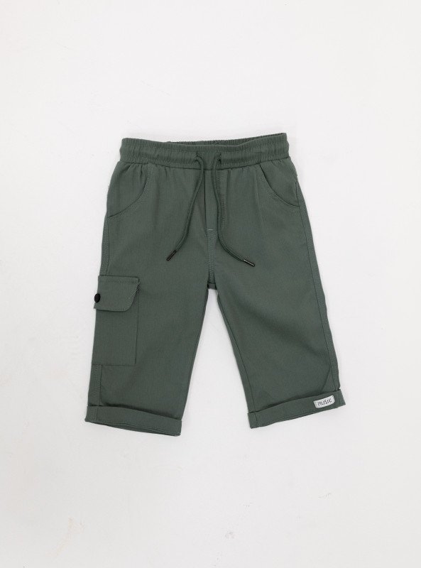 • Cargo Shorts: Deep green cotton shorts with a drawstring waistband for easy wear and a side flap pocket for a cool, utility-inspired touch.