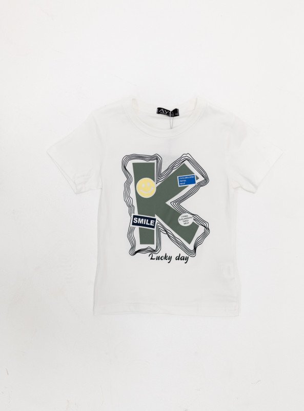 • Graphic Tee: Features a bold “K” print with playful smiley accents and fun text like “Lucky Day” and “Smile.” Made from soft cotton for all-day comfort.