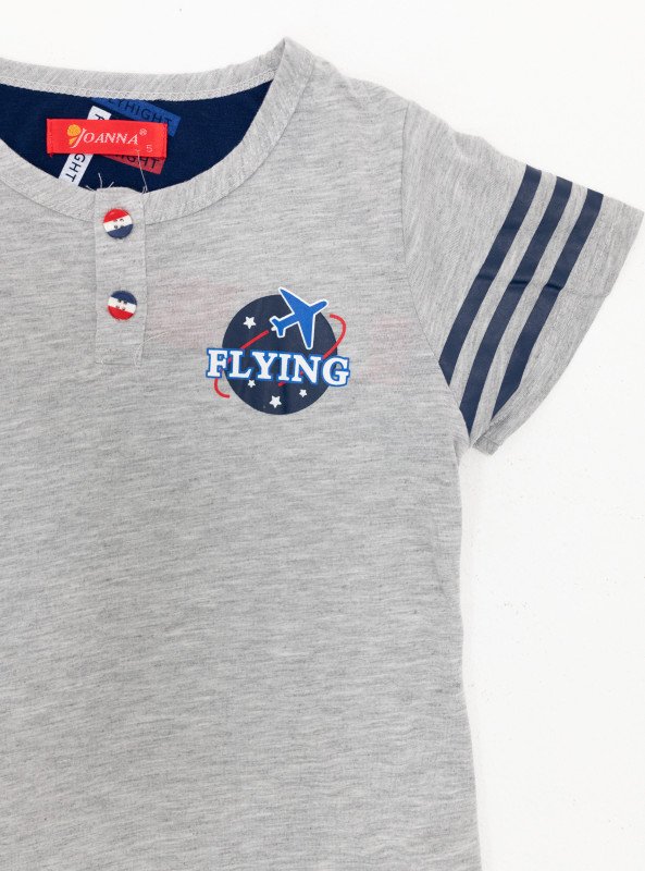 Let your little one drift into dreams of adventure with this fun and comfy boys' pajama set. Featuring a soft, short-sleeve top with a bold "FLYING" airplane graphic and striped sleeve accents, paired with full-length pants covered in playful airplane prints and inspiring text like “Fly higher and farther,” this set is perfect for young explorers.