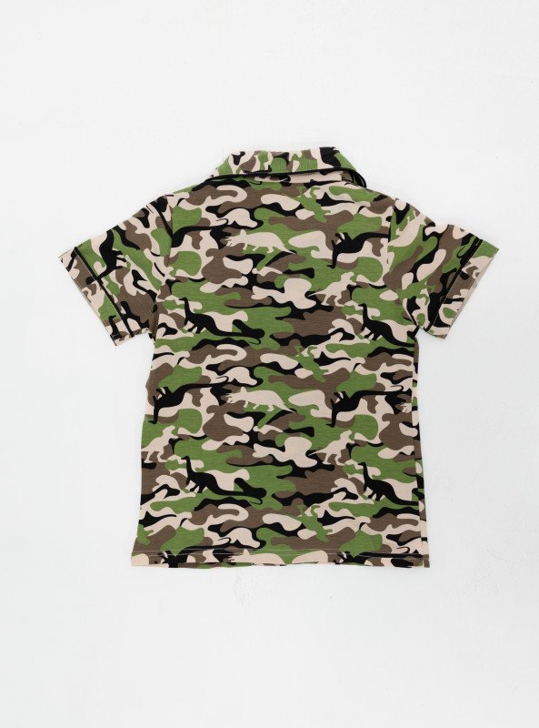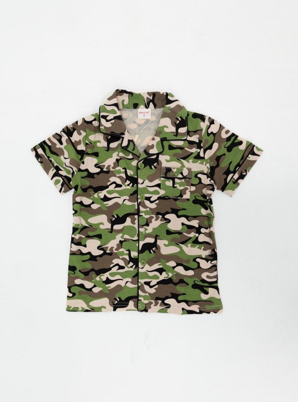 Let your little one sleep in comfort and wake up in style with our Boys' Camouflage Print Pajama Set. Made with a soft and breathable cotton-blend fabric (65% Polyester, 35% Cotton), this two-piece set features a short-sleeve button-up shirt with a chest pocket and elastic waistband full-length pants—ideal for year-round comfort.