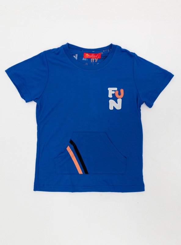 Crafted from a breathable and ultra-soft 50% Polyester / 50% Rayon blend, the fabric offers maximum comfort and durability, making it ideal for active kids who love to move. The tee features a playful "FUN" applique, a sporty front pocket with contrast stripes, and pairs perfectly with the vibrant pants printed with cheerful words like "YES", "COOL", "HAPPY", and more – keeping the mood fun and positive all day long!
