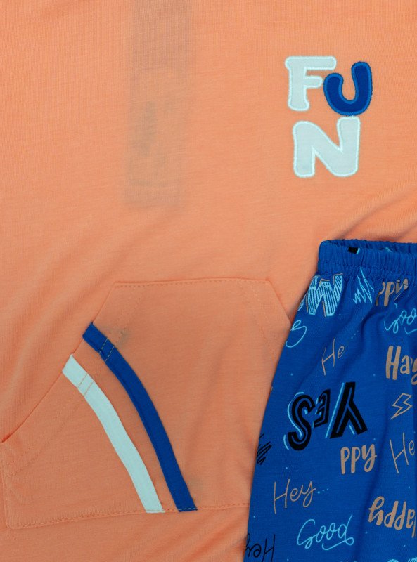 Crafted from a breathable and ultra-soft 50% Polyester / 50% Rayon blend, the fabric offers maximum comfort and durability, making it ideal for active kids who love to move. The tee features a playful "FUN" applique, a sporty front pocket with contrast stripes, and pairs perfectly with the vibrant pants printed with cheerful words like "YES", "COOL", "HAPPY", and more – keeping the mood fun and positive all day long!