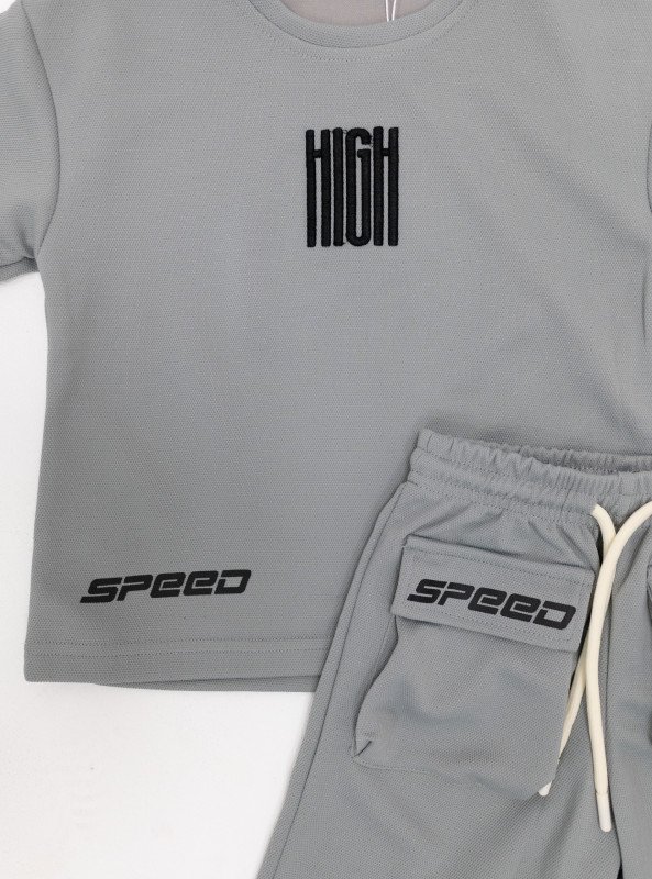 Fuel your boy’s fast-paced days with this bold and sporty “HIGH SPEED” two-piece set. Featuring a clean and modern design, the set includes a crew-neck t-shirt with a vertical “HIGH” print and matching shorts with double SPEED patch pockets on the back for a cool, functional twist.