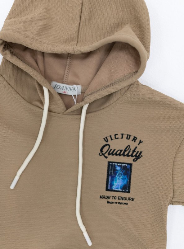 Crafted from 95% Cotton and 5% Elastane, the fabric offers a soft feel with enough stretch for ease of movement. The hood detail brings a trendy, urban twist — ideal for boys who like to stay active and look good doing it.