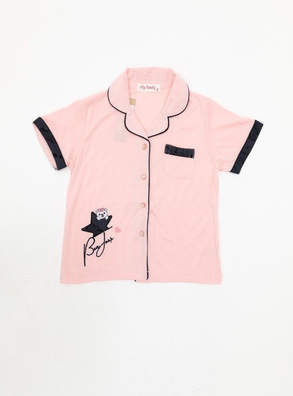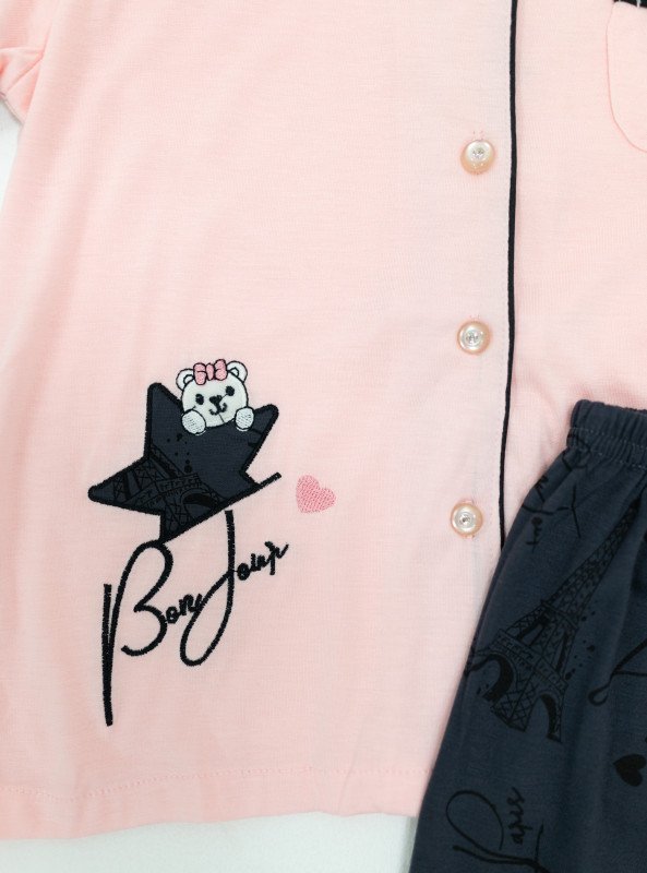 Bring a bit of Parisian charm to bedtime with the Girls' “Bonjour Paris” Pajama Set. Designed with a soft button-up top featuring cute contrast piping and an embroidered bear-on-a-star motif, paired with Eiffel Tower printed pants. The collared shirt design adds a grown-up feel while keeping it fun, stylish, and cozy.
