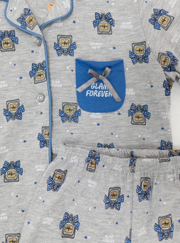 Available in Blue and Gray, each set features a cute all-over print of cartoon TVs with bow accents, playful stars, and a contrasting chest pocket that says "Glam Forever" – adding a trendy, girly touch.