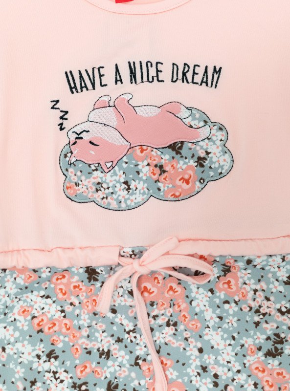 Sweet dreams are made of this adorable girls' nightdress! With its playful top featuring a sleeping cartoon character and "Have a Nice Dream" quote, and a soft, floral-printed skirt, this dress is designed to keep her cozy and cheerful through the night. The relaxed fit and waist tie detail make it as comfortable as it is charming.