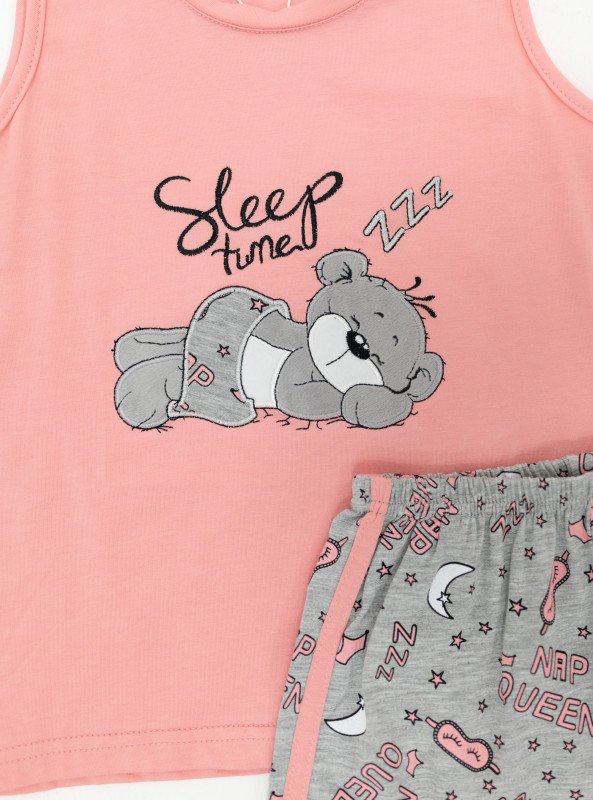 Girls' Sleeveless Cartoon Pajama Set – "Sleep Time" Bear Print
