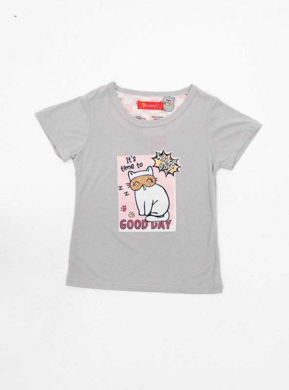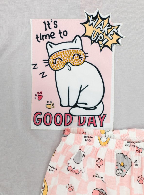 The tee features an adorable sleepy cat print with an eye mask and a cheerful "Wake Up, Good Day" slogan. Paired with printed pajama bottoms covered in charming animal faces and pastel paw prints on a checkered background, it’s a whimsical set she’ll want to wear again and again.