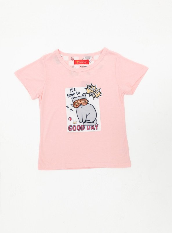 The tee features an adorable sleepy cat print with an eye mask and a cheerful "Wake Up, Good Day" slogan. Paired with printed pajama bottoms covered in charming animal faces and pastel paw prints on a checkered background, it’s a whimsical set she’ll want to wear again and again.