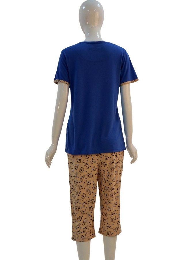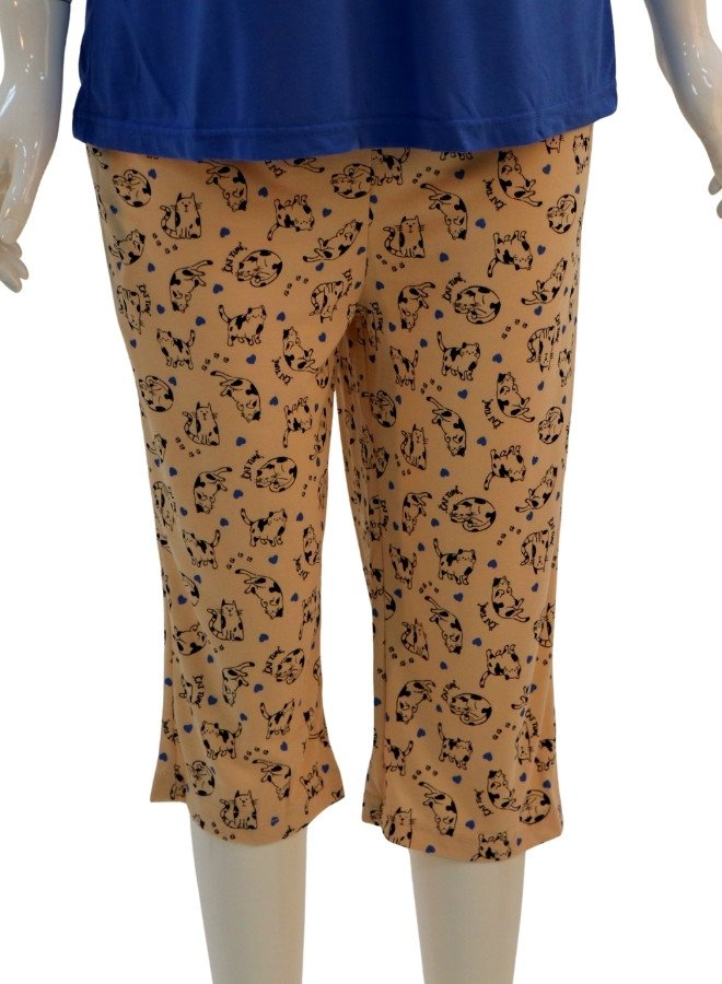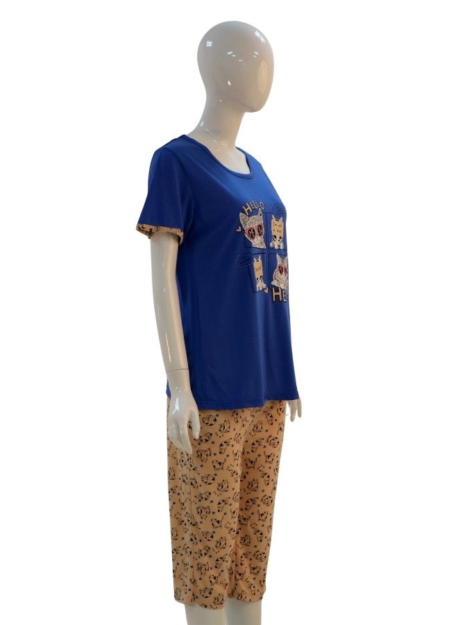 Women's Cotton Printed Cat Loungewear Set – 3/4 Sleeve & Capri Pants - Blue
