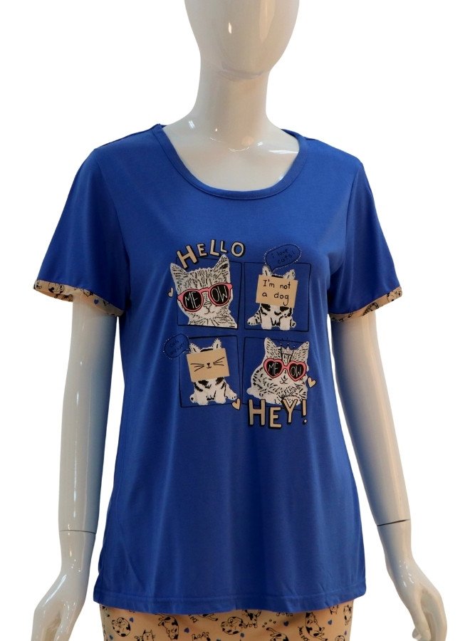 The top features a cheerful cartoon cat print with playful text like “HELLO” and “HEY!” to brighten your mood. Complemented with cute contrast sleeve piping, it pairs effortlessly with the mid-rise printed capri pants that have a stretchy waistband for maximum comfort.