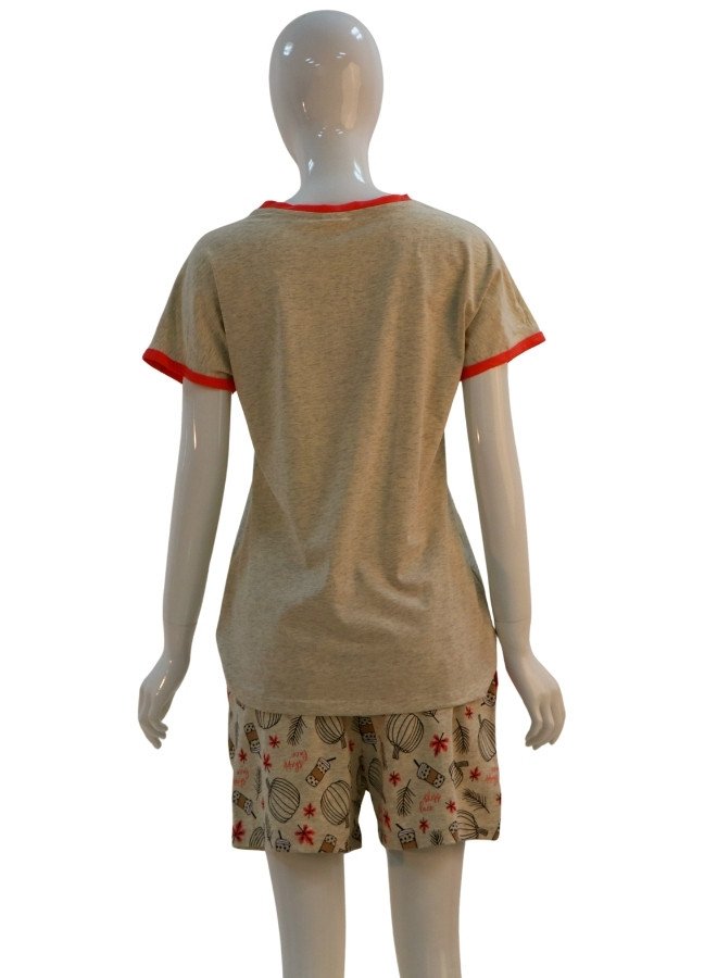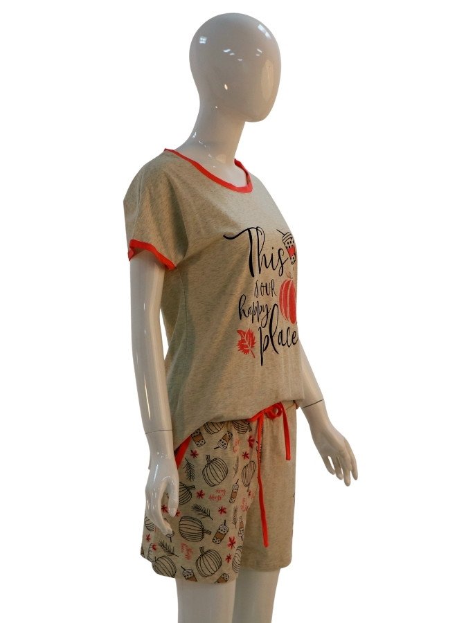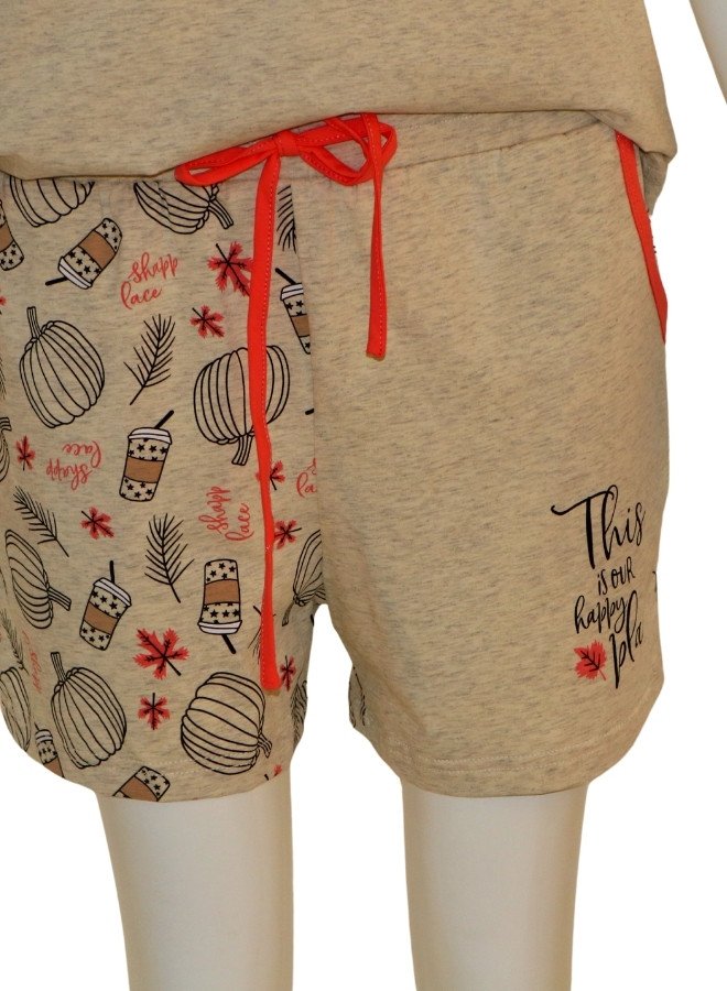 Crafted from soft, breathable cotton, this adorable set features a relaxed-fit top with playful prints and inspiring typography – “This is our happy place”. The set includes coordinating shorts with charming seasonal illustrations like pumpkins, leaves, and coffee cups, adding a touch of whimsy to your downtime. A contrasting neckline and sleeve trim, paired with an adjustable drawstring waistband, ensure a flattering fit with a cute pop of color.