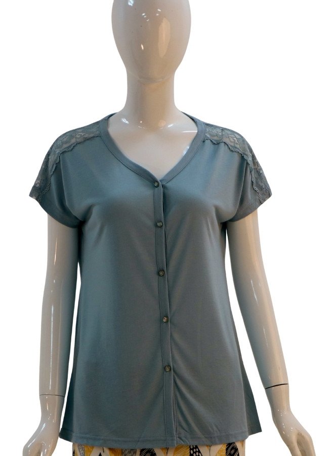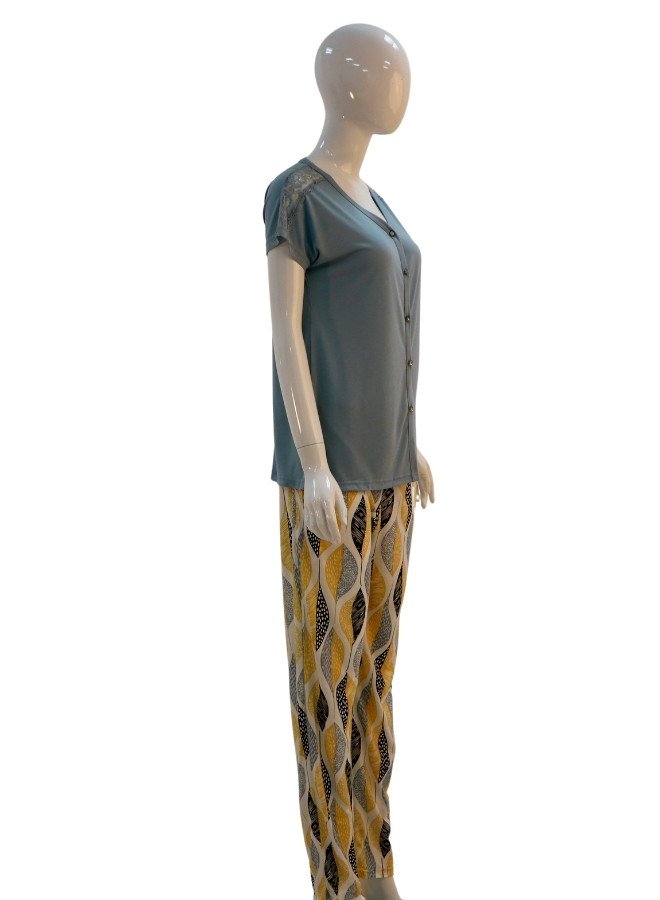 Women’s Printed Pajama Set with Lace Shoulder Detail - Gray